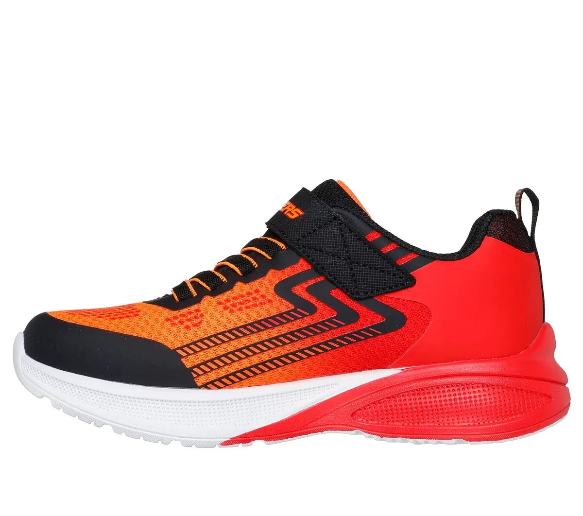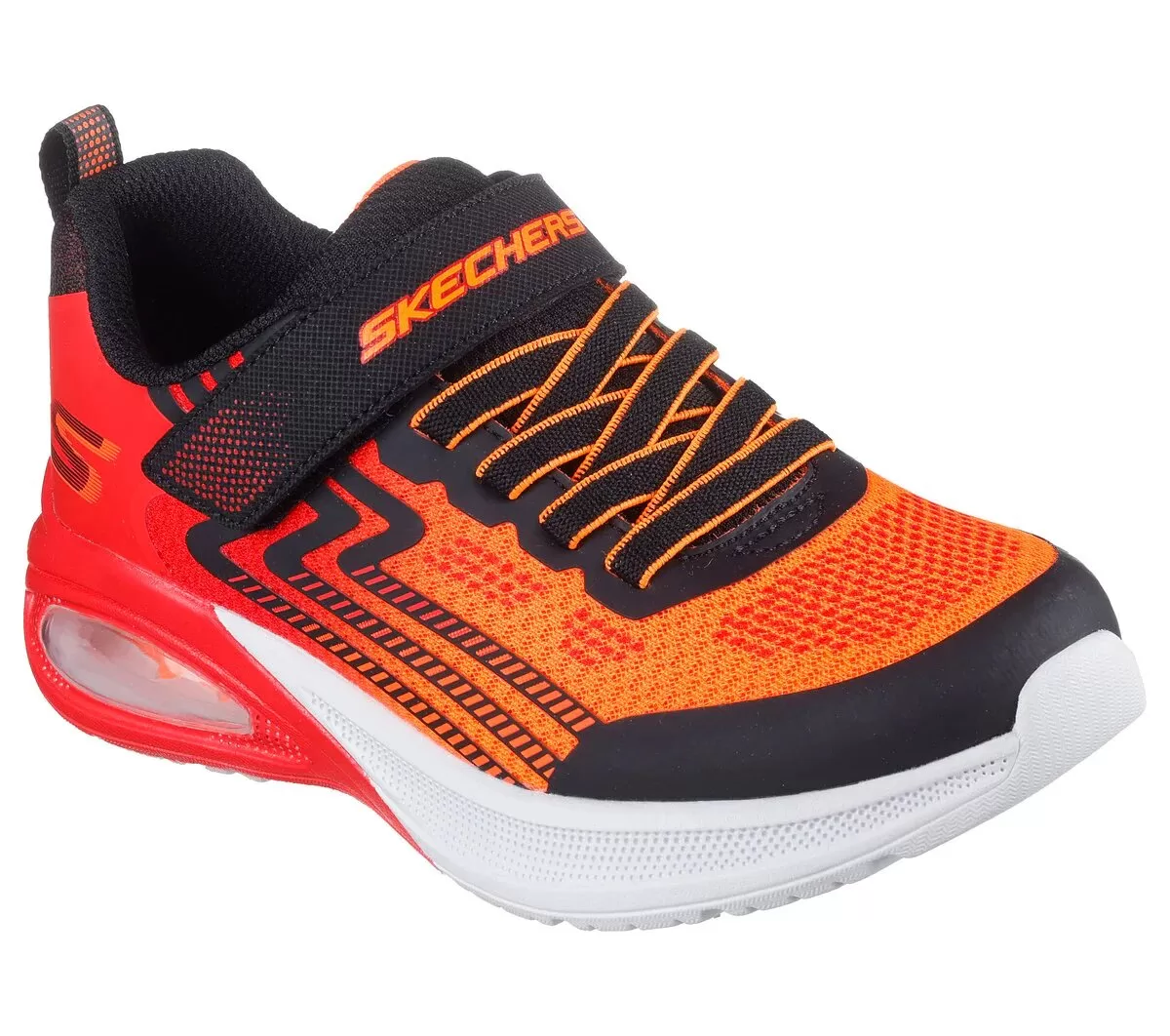 Play all day in easy-wearing comfort with Skechers Microspec Max Advance. This lightweight sporty design features a mesh and synthetic upper with stretch laces, adjustable instep strap, visible Skech-Air® midsole and tech piece, plus a cushioned comfort insole.