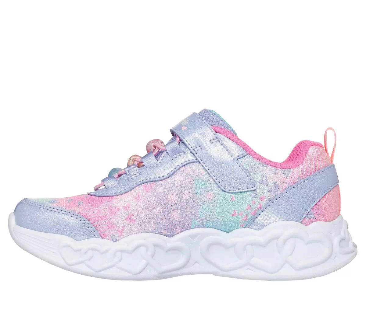 Sparkle and shine in magical delight wearing Skechers Heart Lights® Infinite Heart Lights – Heart Jewels. This Skechers adaptive closure design features a heart-and-star print sparkle mesh upper with synthetic overlays, fixed stretch laces with heart charms, an adjustable instep strap, and a sculpted light-up midsole with ‘heart chain’ detail.