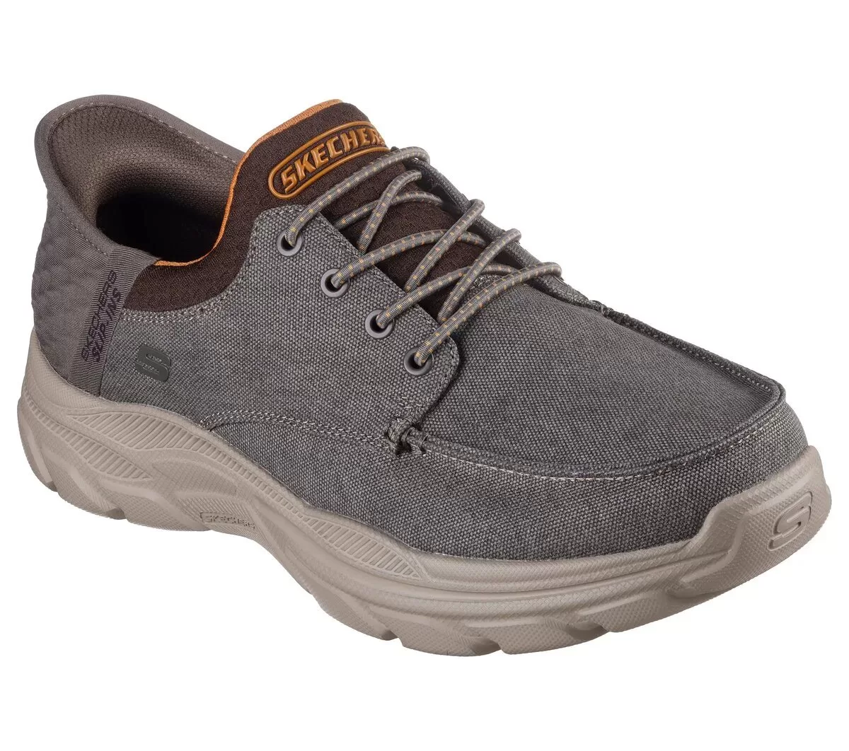 Step into casual roomy comfort and style wearing Skechers Hands Free Slip-ins® Relaxed Fit®: Revolted – Santino. Designed with our exclusive Heel Pillow™, this vegan moc toe slip-on features a canvas upper with stretch laces, Goga Mat Arch™ technology, and a charcoal-infused Air-Cooled Memory Foam® insole.