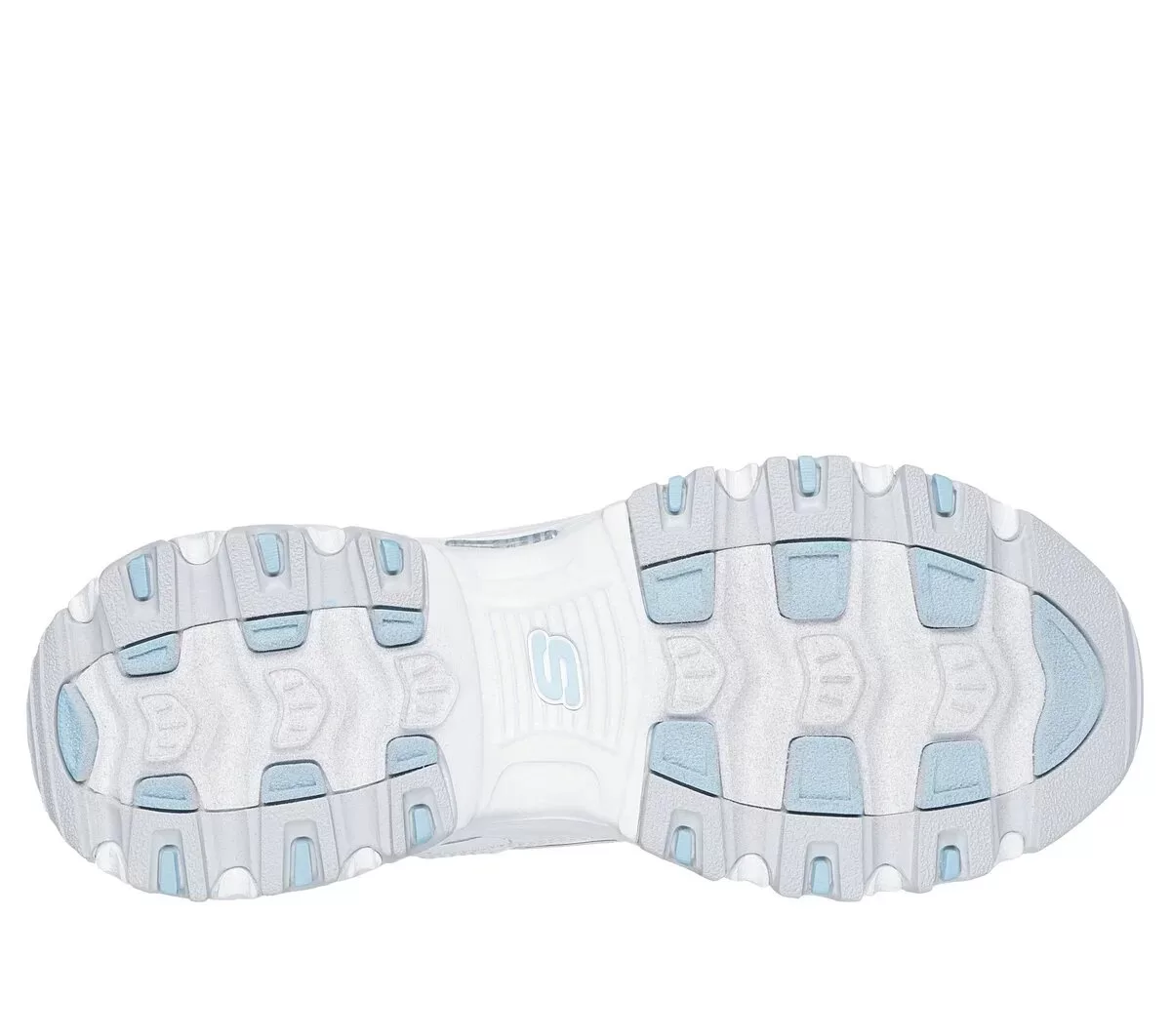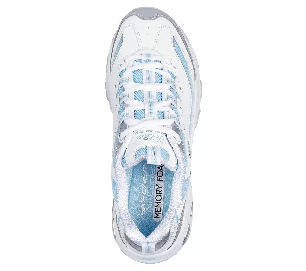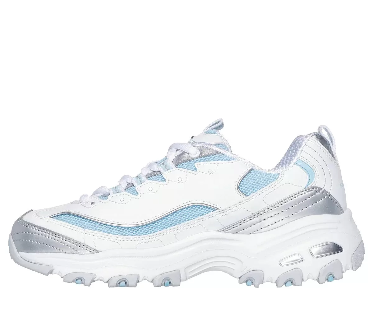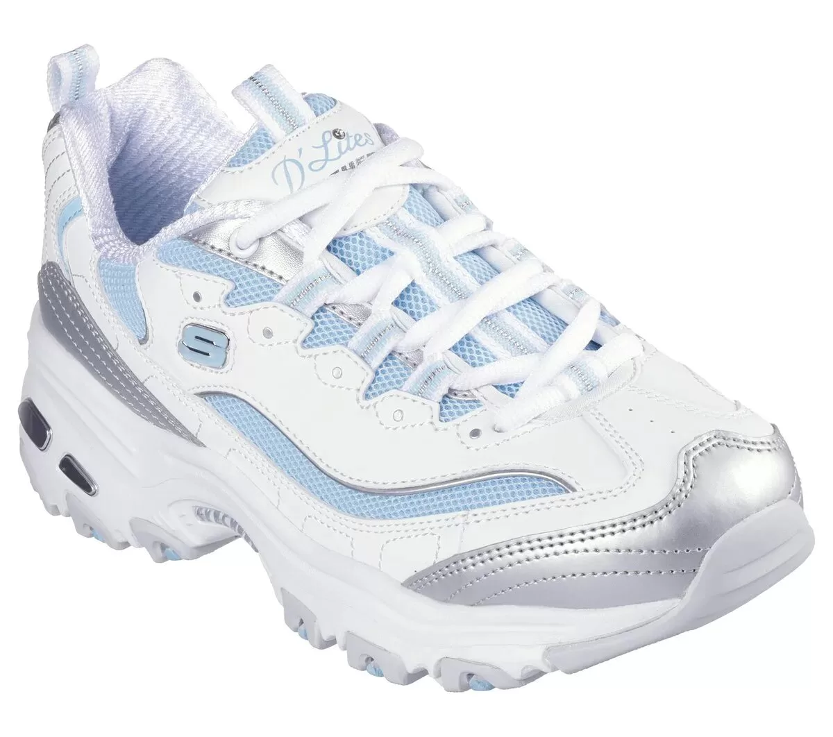 Step out in iconic style and comfort wearing Skechers D’Lites® – Chromatic. This casual lace-up style features a mesh upper with duraleather overlay, metallic details, a cushioned Skechers Air-Cooled Memory Foam® insole, and a shock-absorbing midsole.
