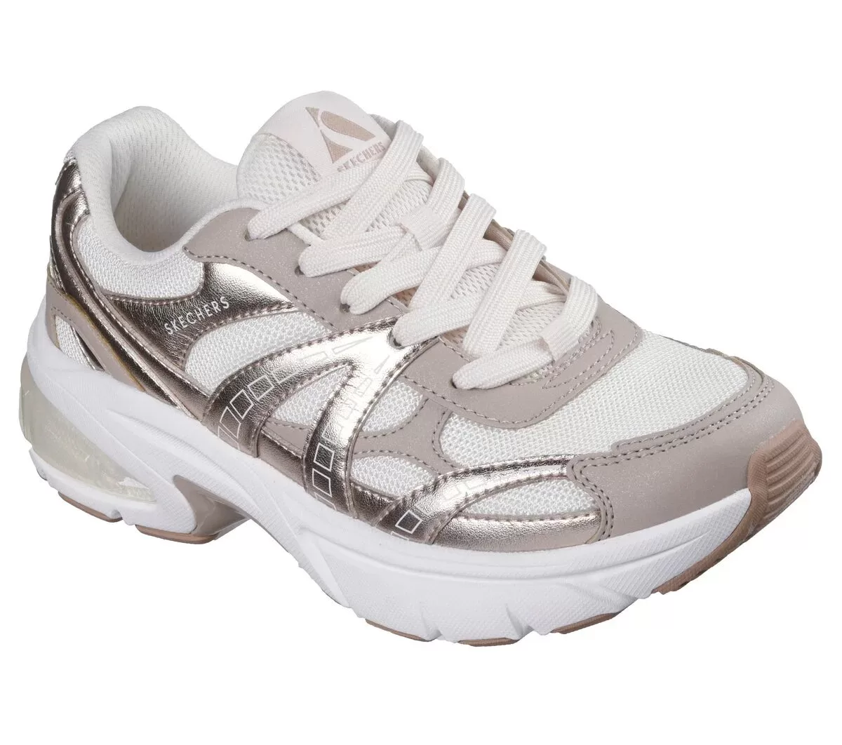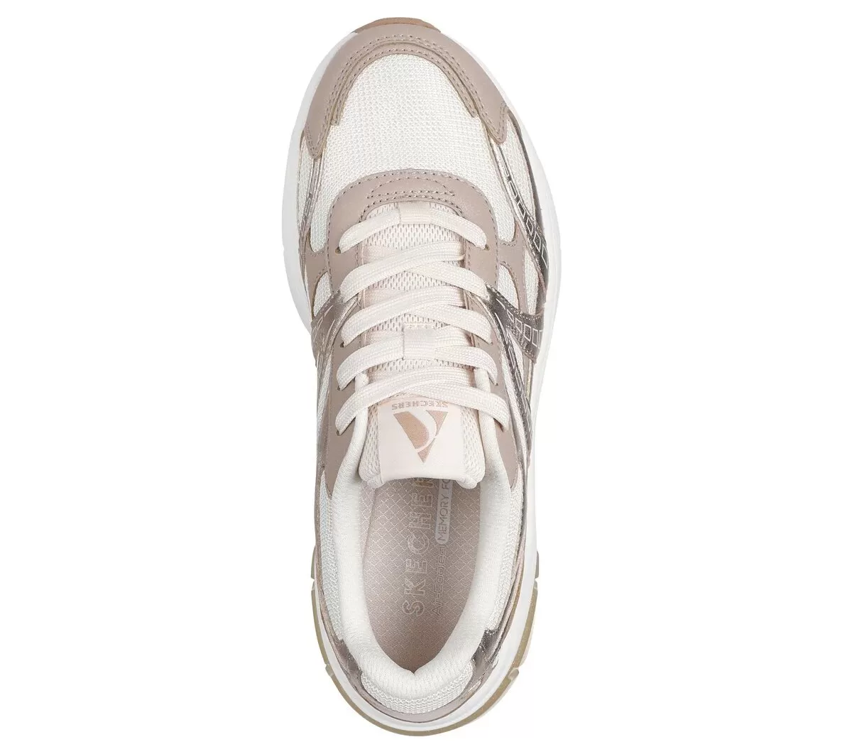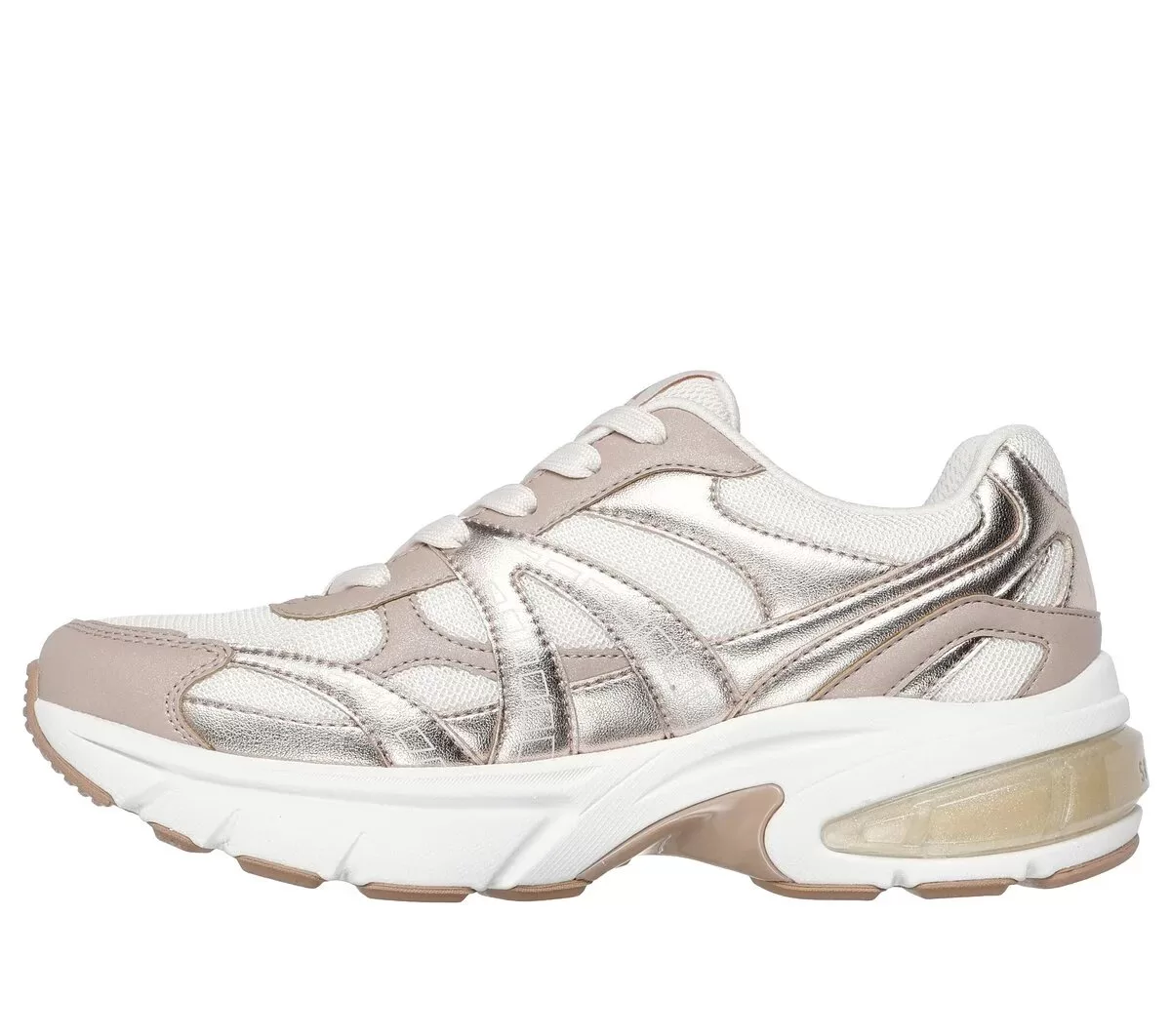 Show off your sporty diva style wearing Skechers Street™ Skechers Shadow – Stellar 90. This lace-up fashion sneaker features a metallic duraleather and mesh upper with a translucent midsole insert and cushioned Skechers Air-Cooled Memory Foam® insole.