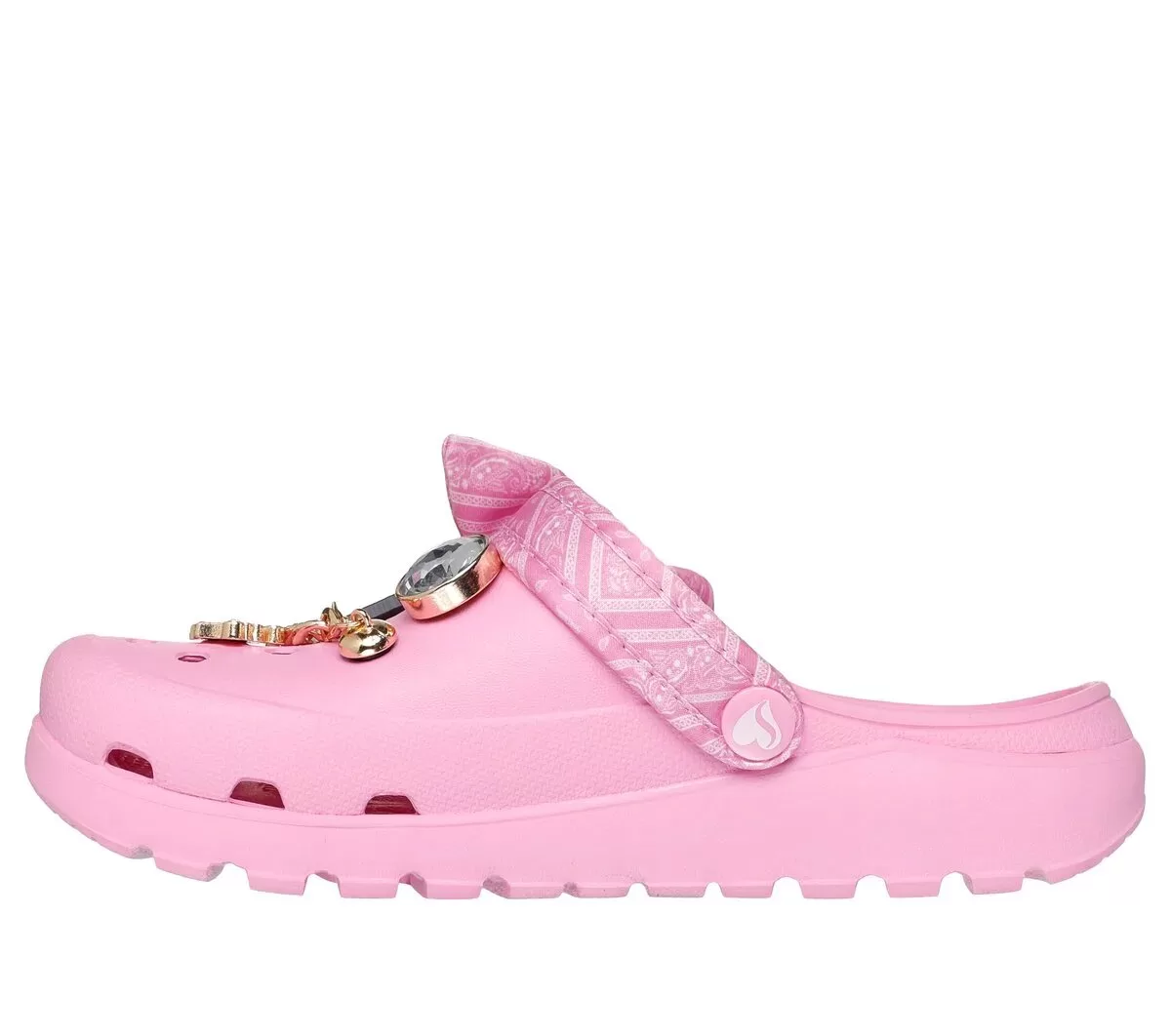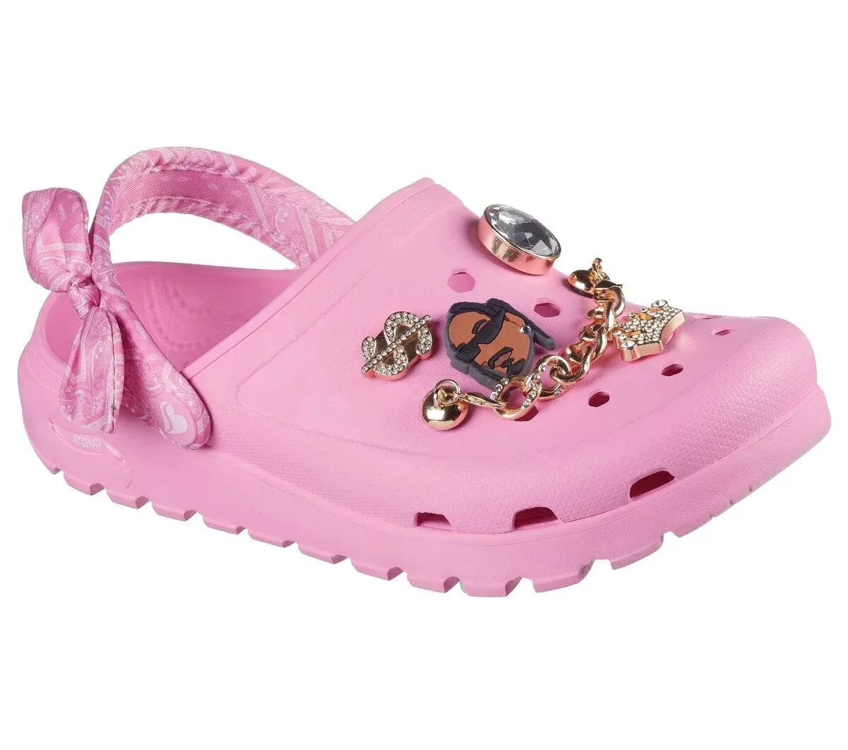 Haute Drop: Rep the D-O-Double-G in G-glam style wearing Skechers x Snoop Dogg: Arch Fit® Footsteps – Rolling Glitz. This head-turning fashion clog features a breathable EVA upper with removable Snoop-themed charms, a satin bandana-wrapped convertible heel strap with bow accent, and a contoured Arch Fit® footbed.