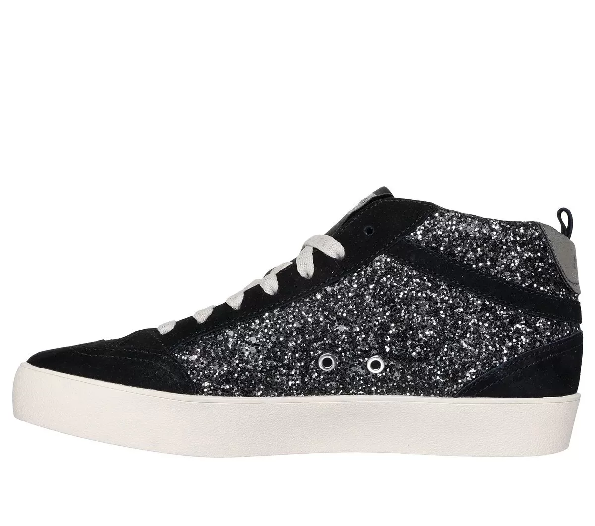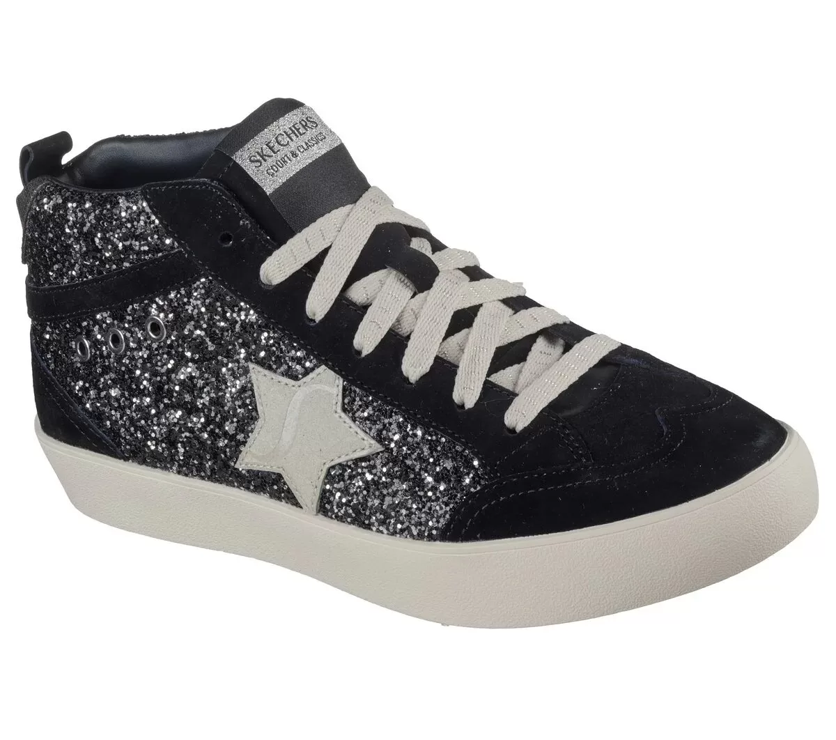 Find your star power style with uncompromising comfort wearing Skechers Strand Star – Golden Glam. This mid-top fashion sneaker features a rock glitter and suede overlay upper with a hidden wedge court-style midsole, lace-up front, star patch quarter detail, and a Skechers Air-Cooled Memory Foam® cushioned insole.