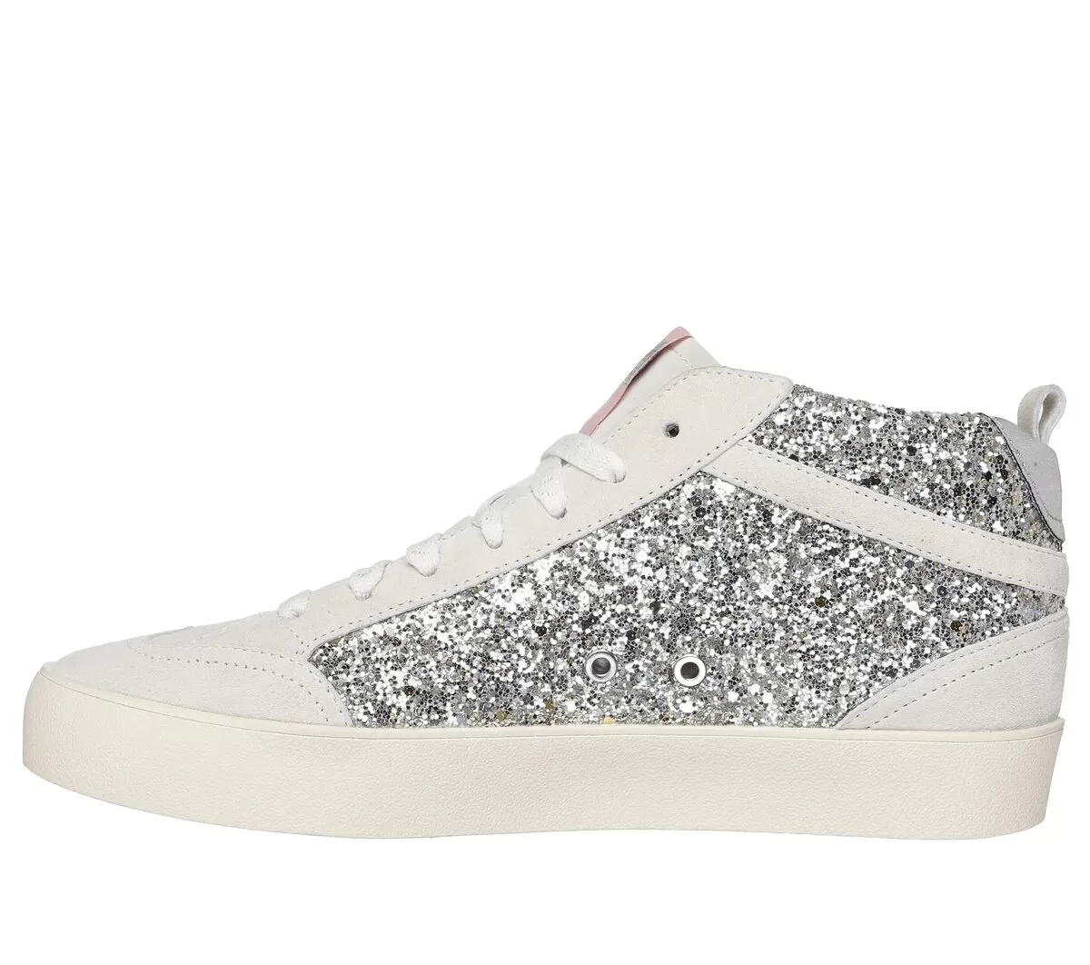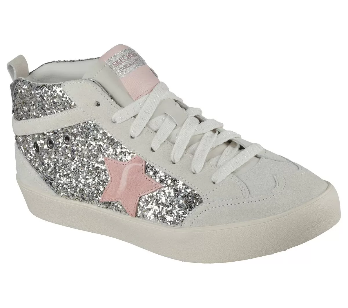 Find your star power style with uncompromising comfort wearing Skechers Strand Star – Golden Glam. This mid-top fashion sneaker features a rock glitter and suede overlay upper with a hidden wedge court-style midsole, lace-up front, star patch quarter detail, and a Skechers Air-Cooled Memory Foam® cushioned insole.