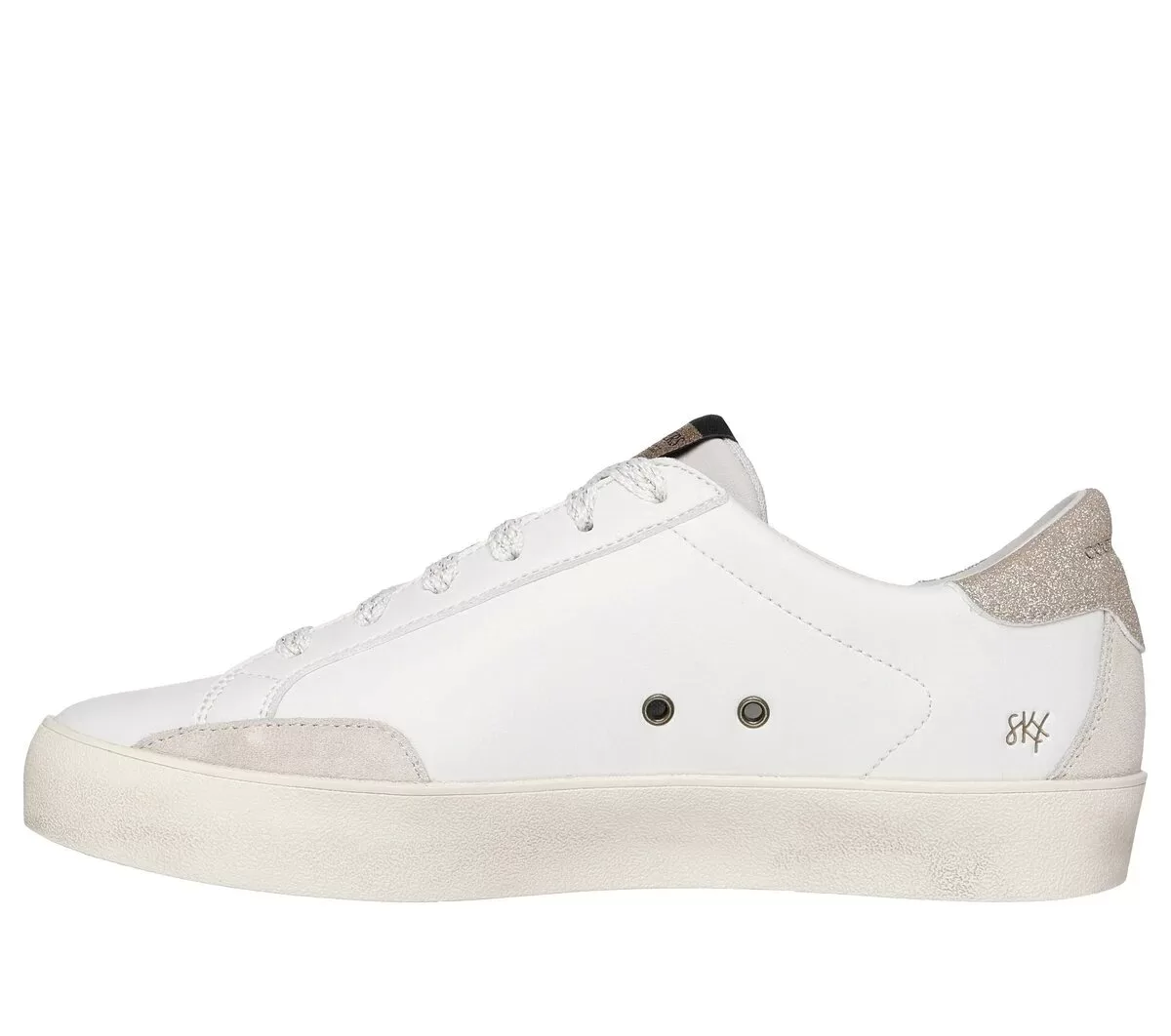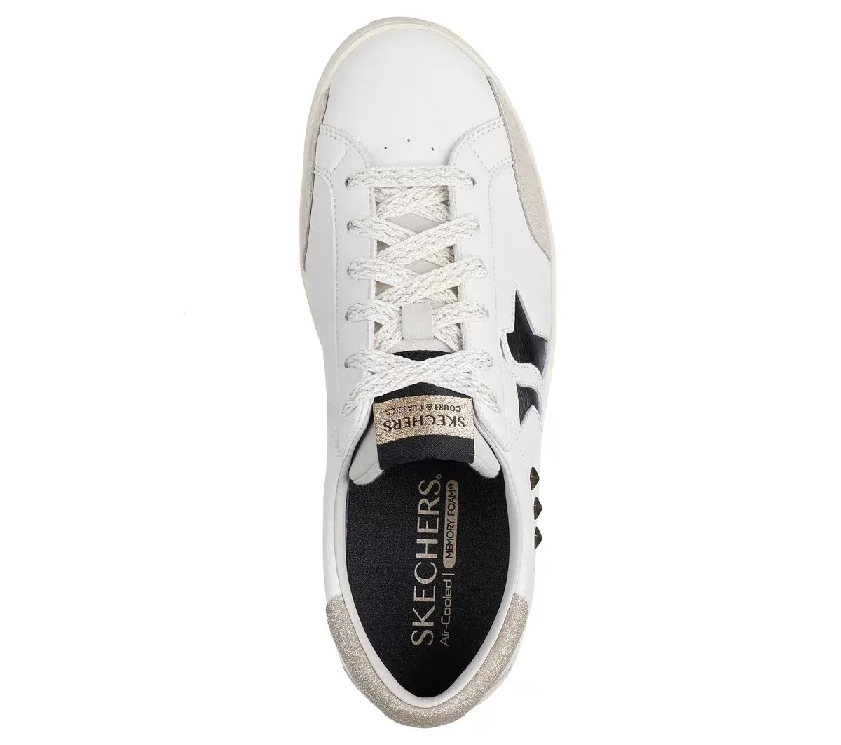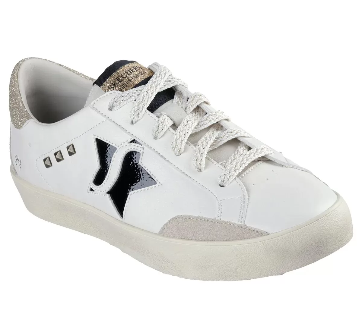 Find your star power style with uncompromising comfort wearing Skechers Strand Star – Pretty Vintage. This low-top fashion lace-up features a duraleather and suede overlay upper with star and stud quarter details, a Skechers Air-Cooled Memory Foam® cushioned insole, and court-style midsole with hidden heel wedge.