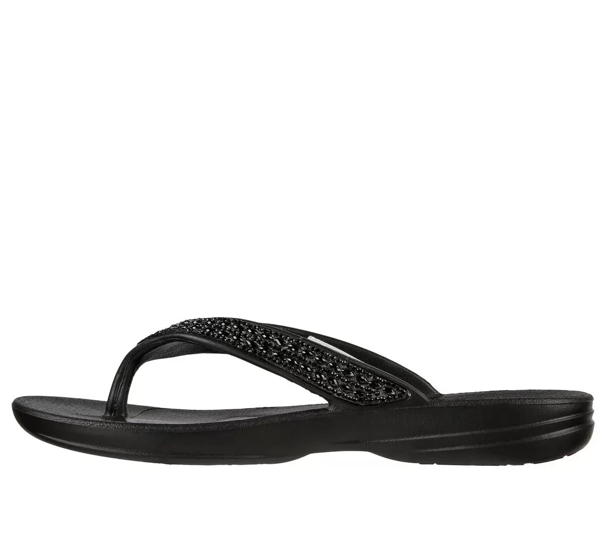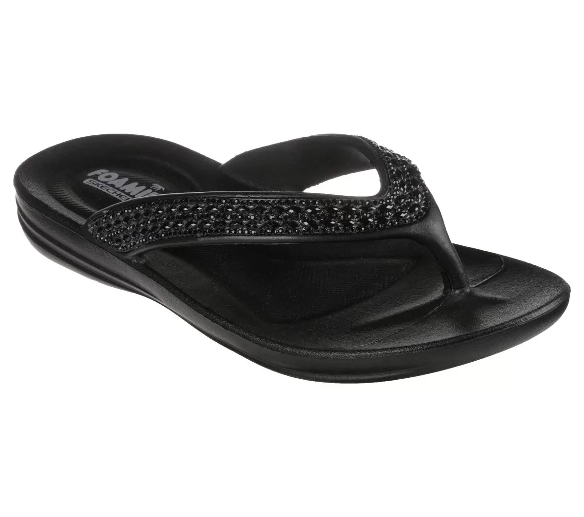 Sparkle up your summer style with Skechers Foamies®: Glitzy. This casual sculpted thong sandal features a flexible EVA upper with rhinestone embellishments, plus a contoured cushioned footbed.