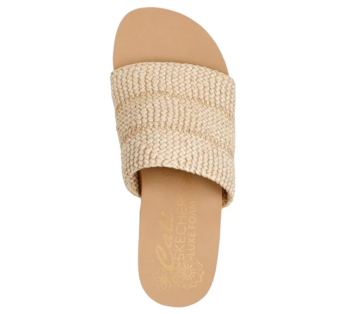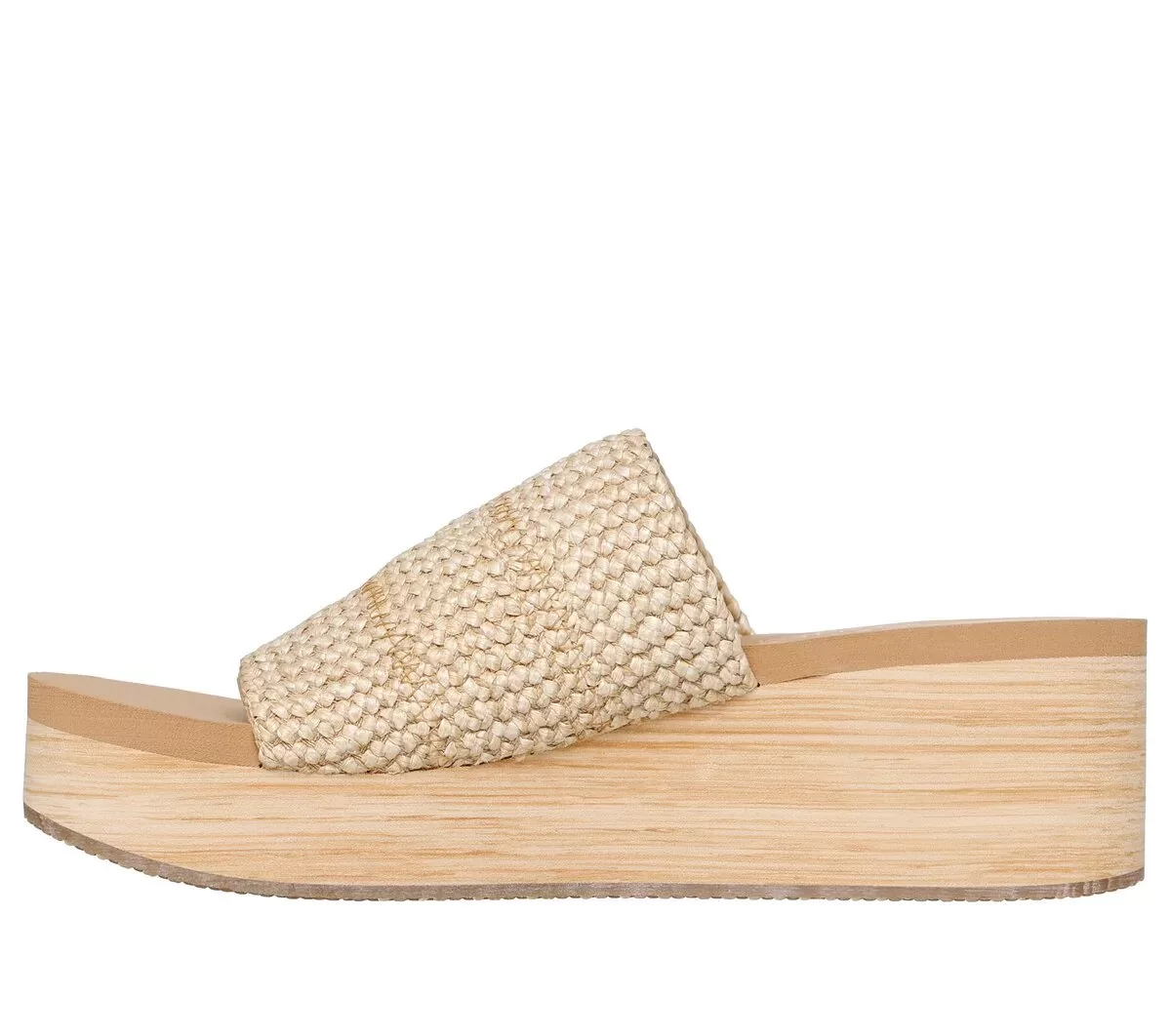 Bring your sunny day style to new heights of comfort wearing Skechers Cali® Summers – Salt Spray. This vegan platform slide features a single-band faux raffia upper, woodgrain veneer midsole, and a cushioned Luxe Foam® footbed.
