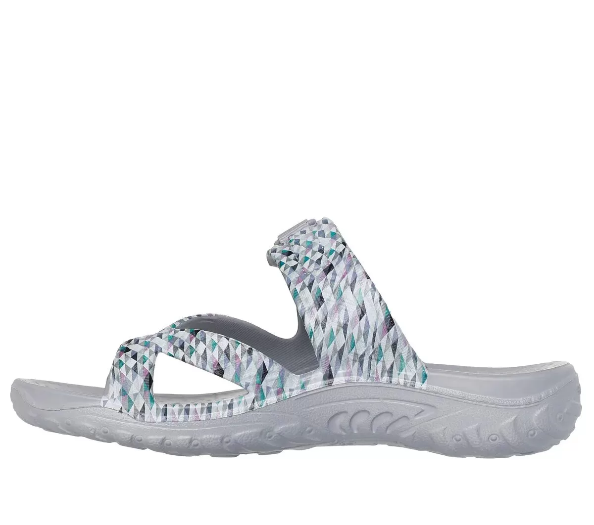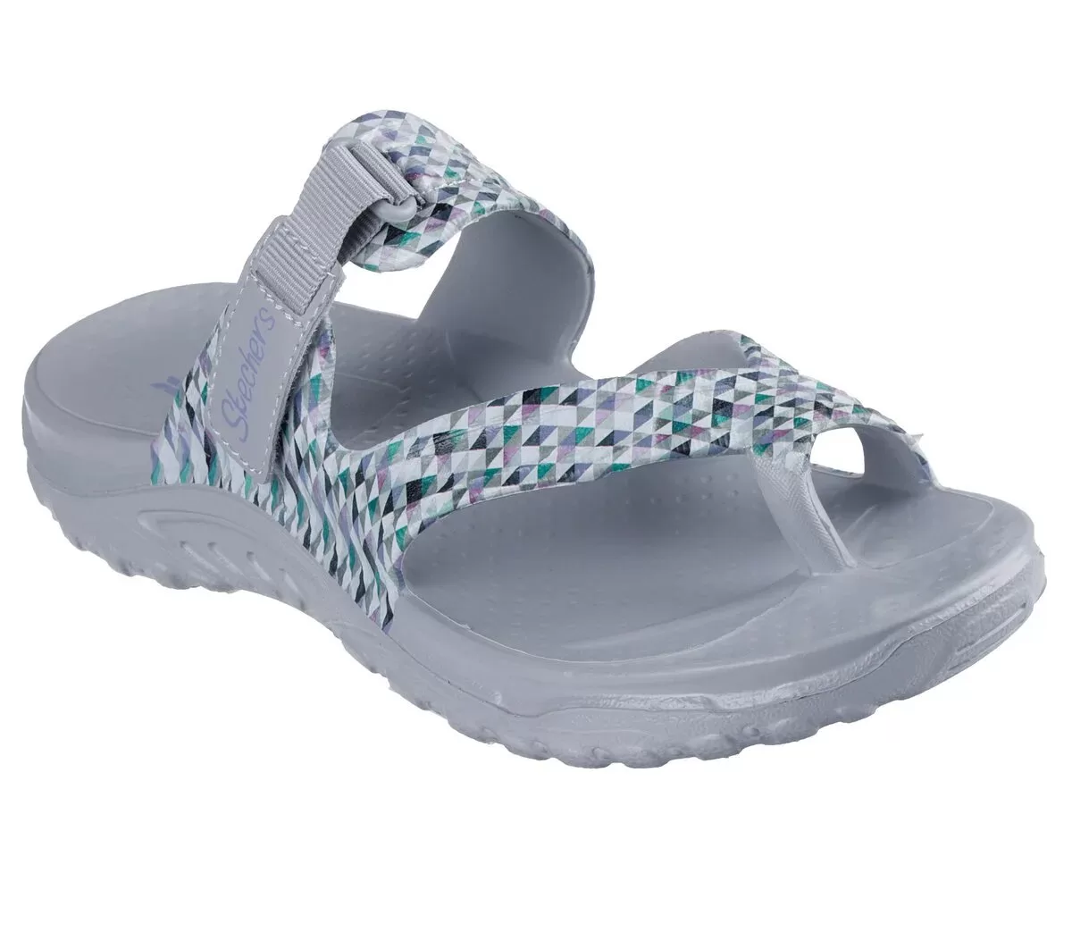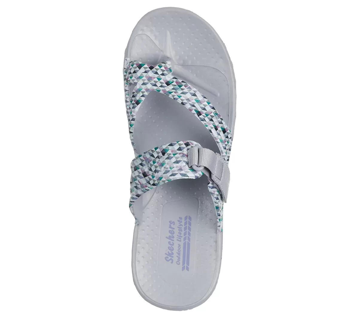 Enjoy breezy comfort in style with Skechers Foamies®: Reggae – Scenery. This sculpted toe-loop sandal features a geometric print Foamies® EVA upper with an adjustable woven strap, and a cushioned comfort footbed.