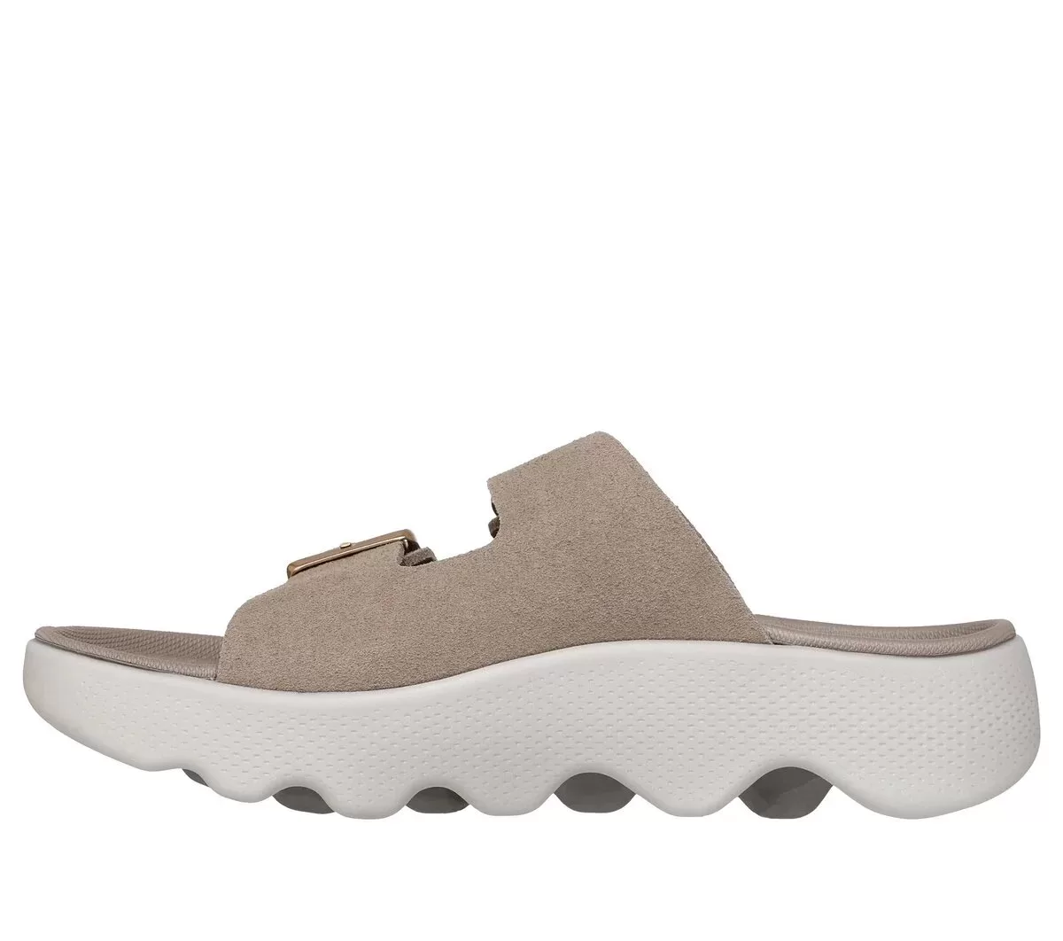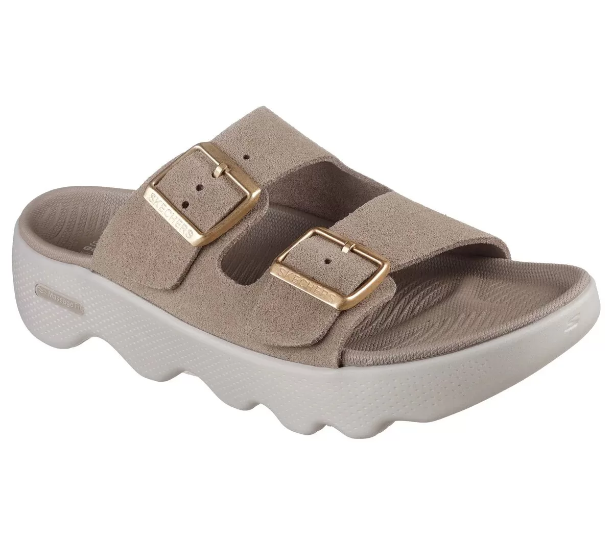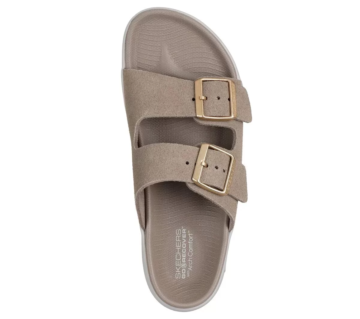 Feel cloud-like comfort with every step in Skechers Massage Fit™ Revive – Honey. This innovative vegan recovery sandal features a double band suede upper with buckle detail, an ultra-lightweight, responsive HYPER BURST® cushioned midsole, and a contoured Goga Mat® footbed with Arch Comfort® for added support.