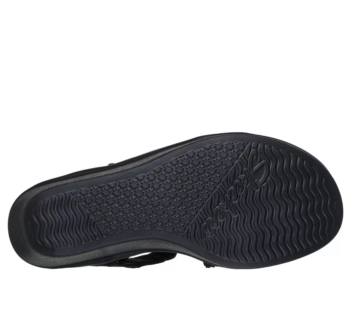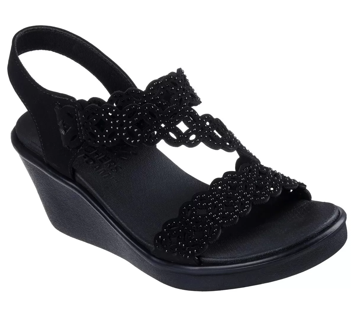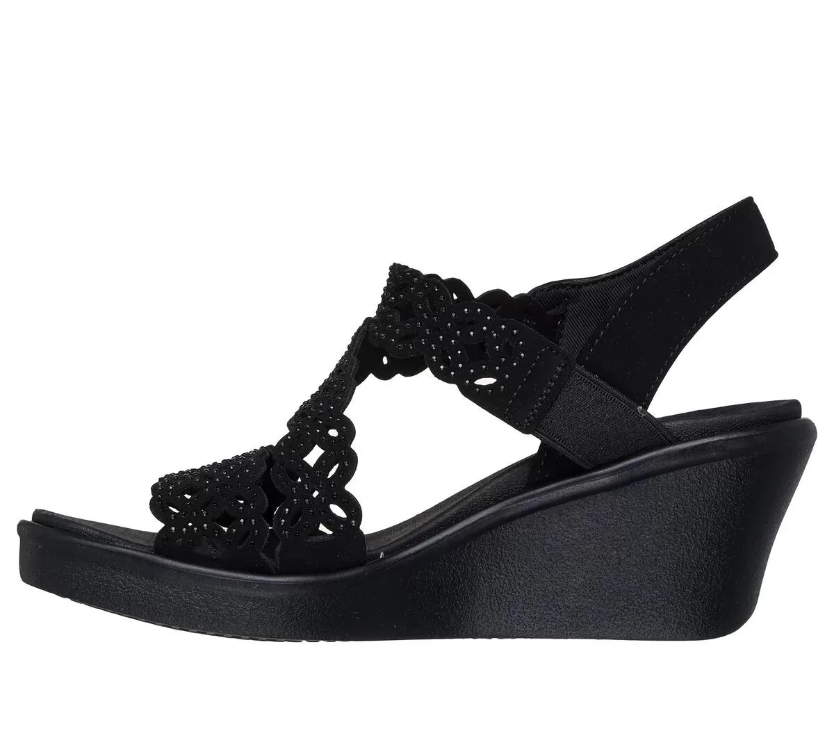 Glam style comfort and looks combine in Skechers Cali® Rumble On – Sassier Dayz. This wedge sandal features a rhinestone embellished laser cut vegan leather upper with a pull-on slingback strap and a cushioned Luxe Foam® footbed.